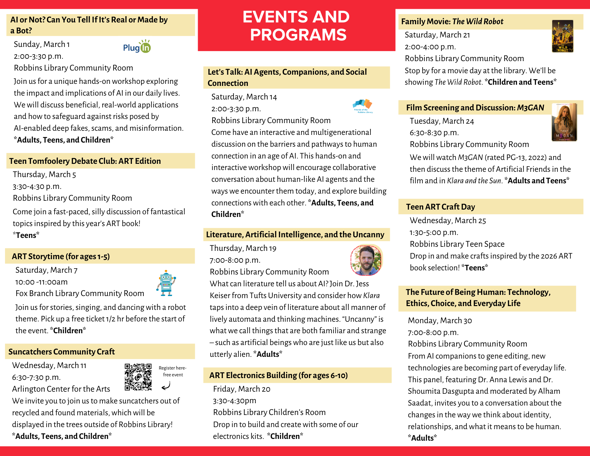 Come have an interactive and multigenerational discussion on the barriers and pathways to human connection in an age of AI. This hands-on and interactive workshop will encourage collaborative conversation about human-like AI agents and the ways we encounter them today, and explore building connections with each other. If you would like to help us prepare the workshop, click here to share with us your familiarity with AI. Sponsored by the Friends of the Robbins Library. Adults, Teens, and Children