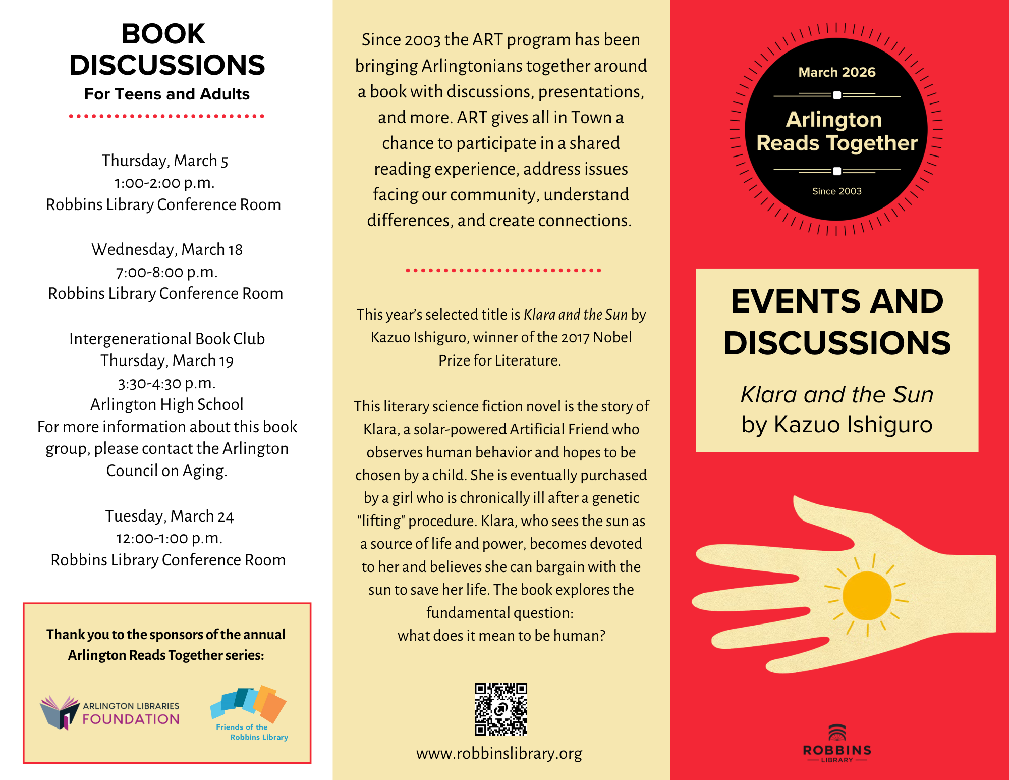 The library’s annual community read program, Arlington Reads Together (ART), returns in March 2026. This year’s selected title is Klara and the Sun by Kazuo Ishiguro, Nobel Laureate in Literature.